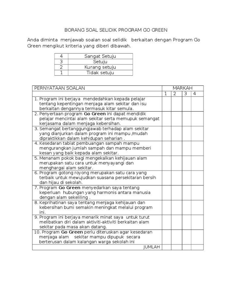 Borang soal selidik program. Sila klik satu persatu gambar di bawah sekali ini untuk paparan yang lebih jelas. Ada beberapa contoh seperti di bawah senaraian soalan soal selidik geografi pt3 yang kami kongsikan bersama dengan anda. Diunggah oleh hamizah ajam. Borang kaji selidik yang dibina terbahagi kepada empat bahagian iaitu.