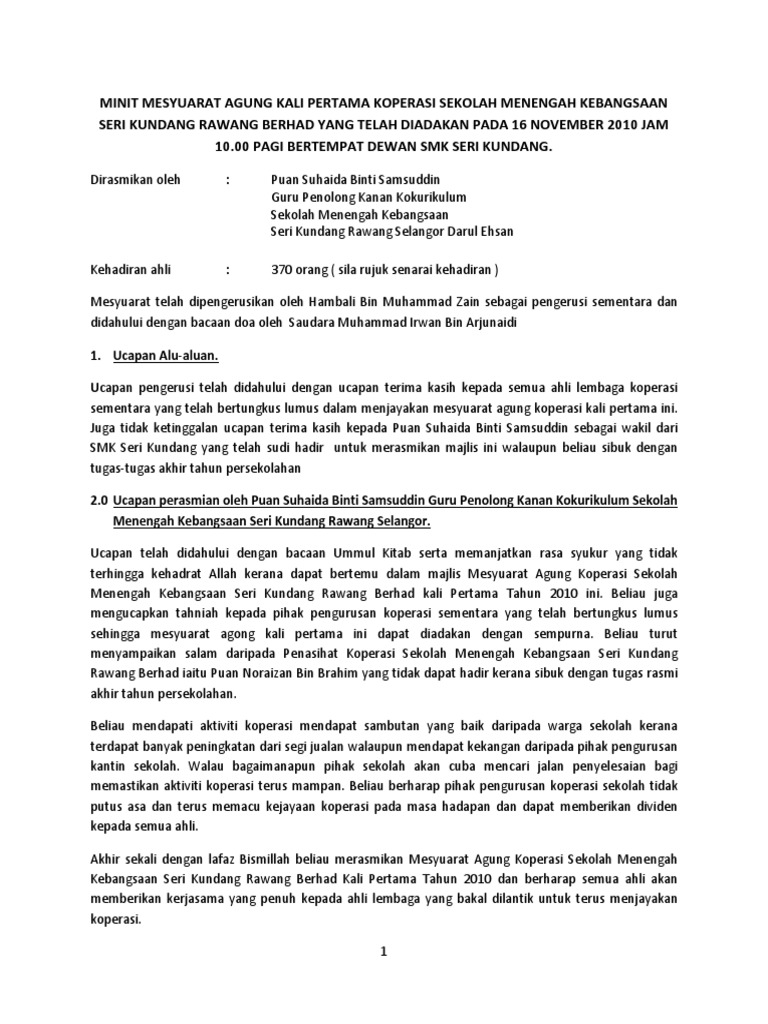 Minit Mesyuarat Agung Kali Pertama Koperasi Sekolah Menengah Kebangsaan Seri Kundang Rawang Berhad Yang Telah Diadakan Pada 16 November 2010 Jam 10 00 Pagi Bertempat Dewan Smk Seri Kundang