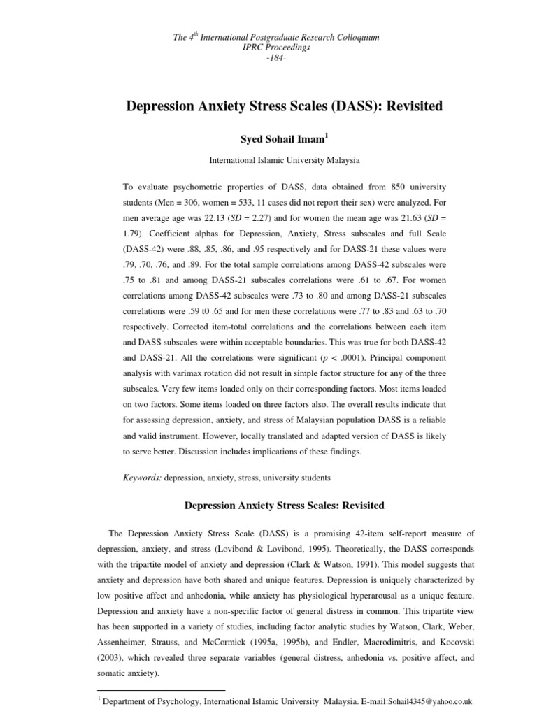 Pdf Validation And Psychometric Properties Of Bahasa Malaysia Version Of The Depression Anxiety And Stress Scales Dass Among Diabetic Patients Ang Kim Teng Academia Edu