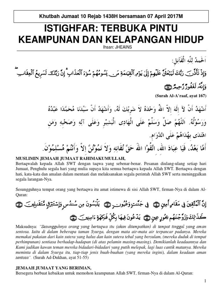 Jheains tidak akan bertanggungjawab terhadap sebarang kehilangan atau kerosakan yang dialami kerana menggunakan maklumat dalam laman ini. Hadirin jemaah jumaat yang dikasihi allah swt sekalian mengakhiri khutbah pada hari ini adalah diharapkan semoga tiga perkara yang disebutkan tadi yang menjadi teras kemerdekaan ini iaitu penghayatan beragama penguasaan ilmu dan ikatan perpaduan dapat bersama sama diterjemahkan dalam kehidupan kita. Paparan terbaik menggunakan pelayar safari ie8 mozila firefox google chrome dengan resolusi 1280 x 800. Teks khutbah jumaat siri 03 2017 makanan halal tetapi tercemar kotor 20 01 2017 muatturun multimedia khutbah siri 03 2017.