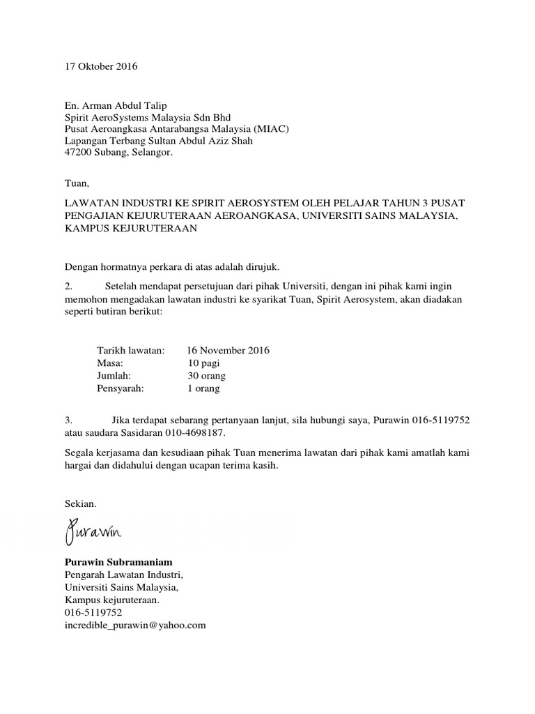 Surat Rasmi Memohon Lawatan Industri Spirit Pdf