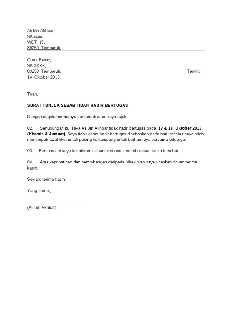 Contoh Surat Rasmi Tunjuk Sebab Tidak Hadir Kerja Rasmi Sua
