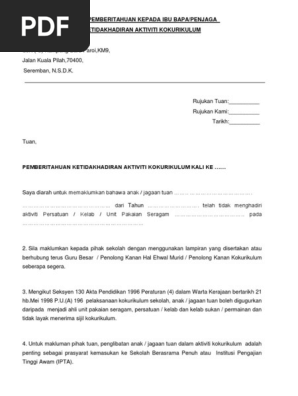 Surat Rasmi Tidak Hadir Ke Aktiviti Kokurikulum