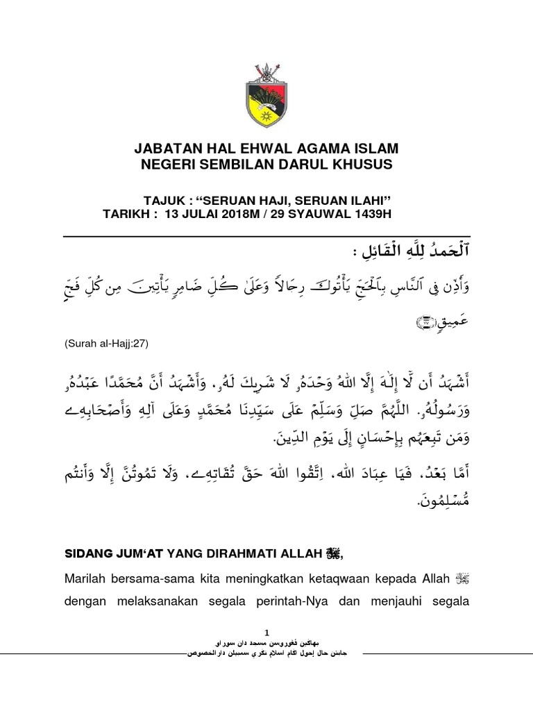 7683 Teks Khutbah Jumaat Julai 2018 Minggu 2 Tajuk Seruan Haji Seruan Pdf