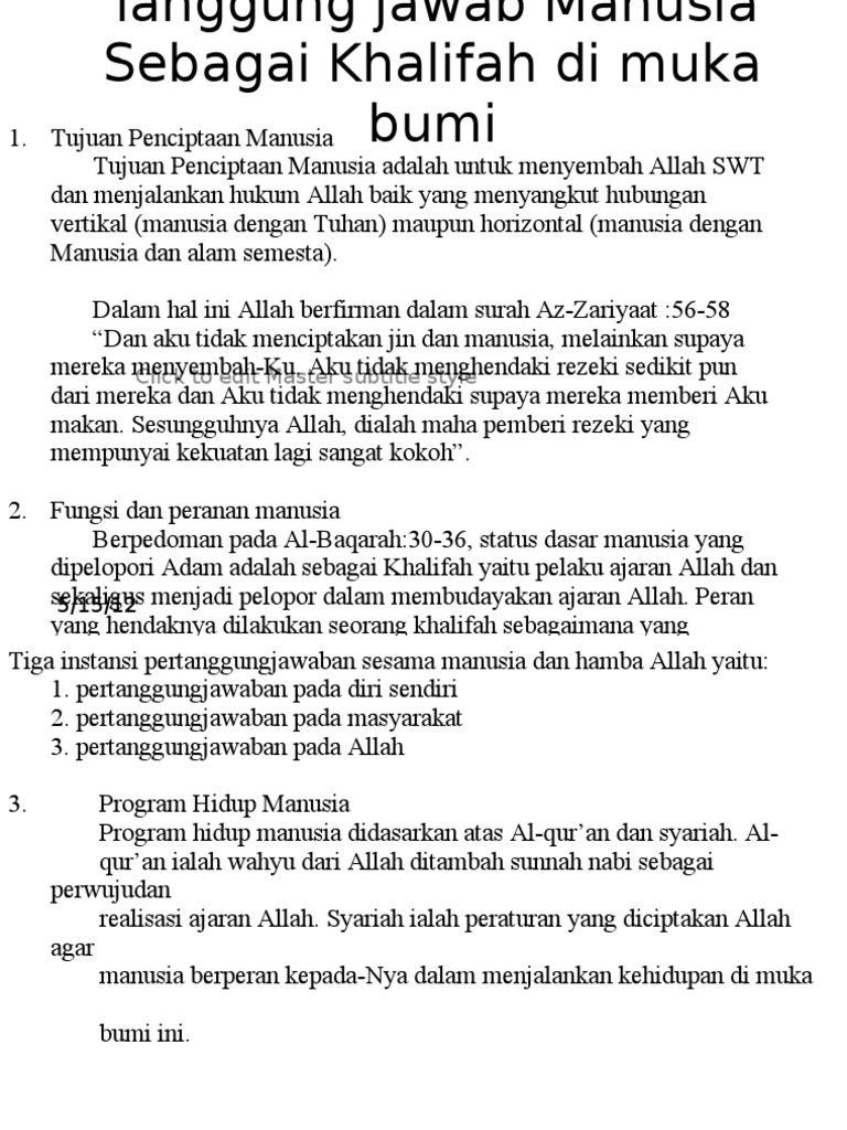 1 sebagai abdullah yakni hamba allah yang harus tunduk dan taat terhadap segala aturan dan kehendaknya serta mengabdi hanya kepadanya. Malaikat menyangsikan kemampuan manusia dalam mengemban tugas sebagai manusia. Dan manusia ditunjuk oleh allah sebagai khalifah untuk mengemban tugas menjaga apa yang ada di bumi ini. 30 ingatlah ketika tuhanmu berfirman kepada para malaikat.
